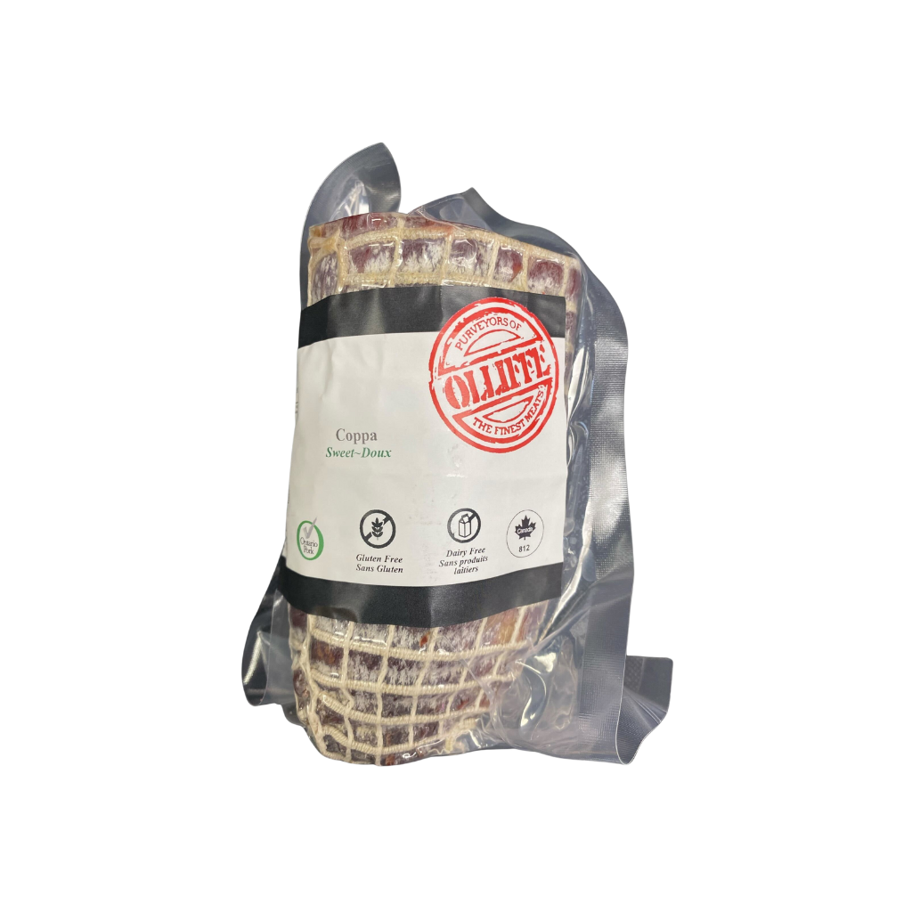 This delectable dry-cured deli meat is ideal for charcuterie. Rowe Farms is proud to carry this exceptional local product that's made by Olliffe (part of the Harvest to Gather family of companies). Olliffe has been serving customers in the Rosedale neighbourhood of Toronto since 1975. A traditional butcher shop that offers high quality Ontario beef, poultry, lamb, pork products and more, Olliffe produces a variety of delicious prepared meals, spice blends and condiments in house. SKU: 60081
