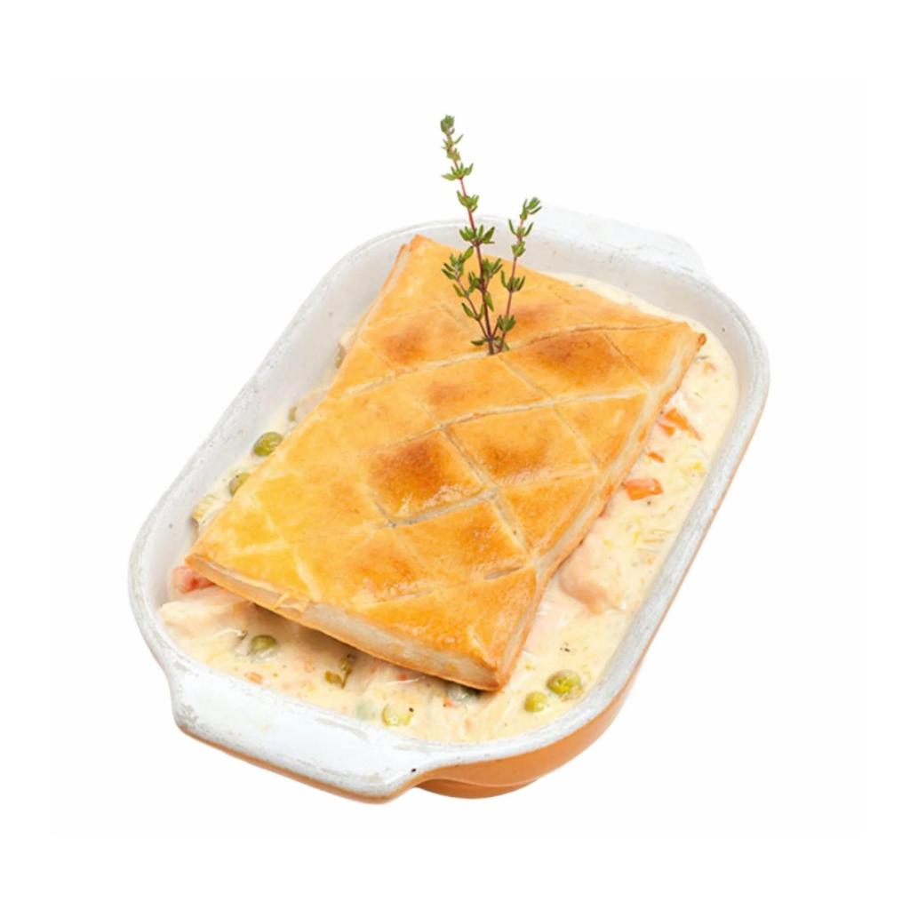 Ingredients: Boneless chicken breast, carrots, celery, leeks, pearl onions, cream, chicken stock, garlic, flour. Puff pastry lid